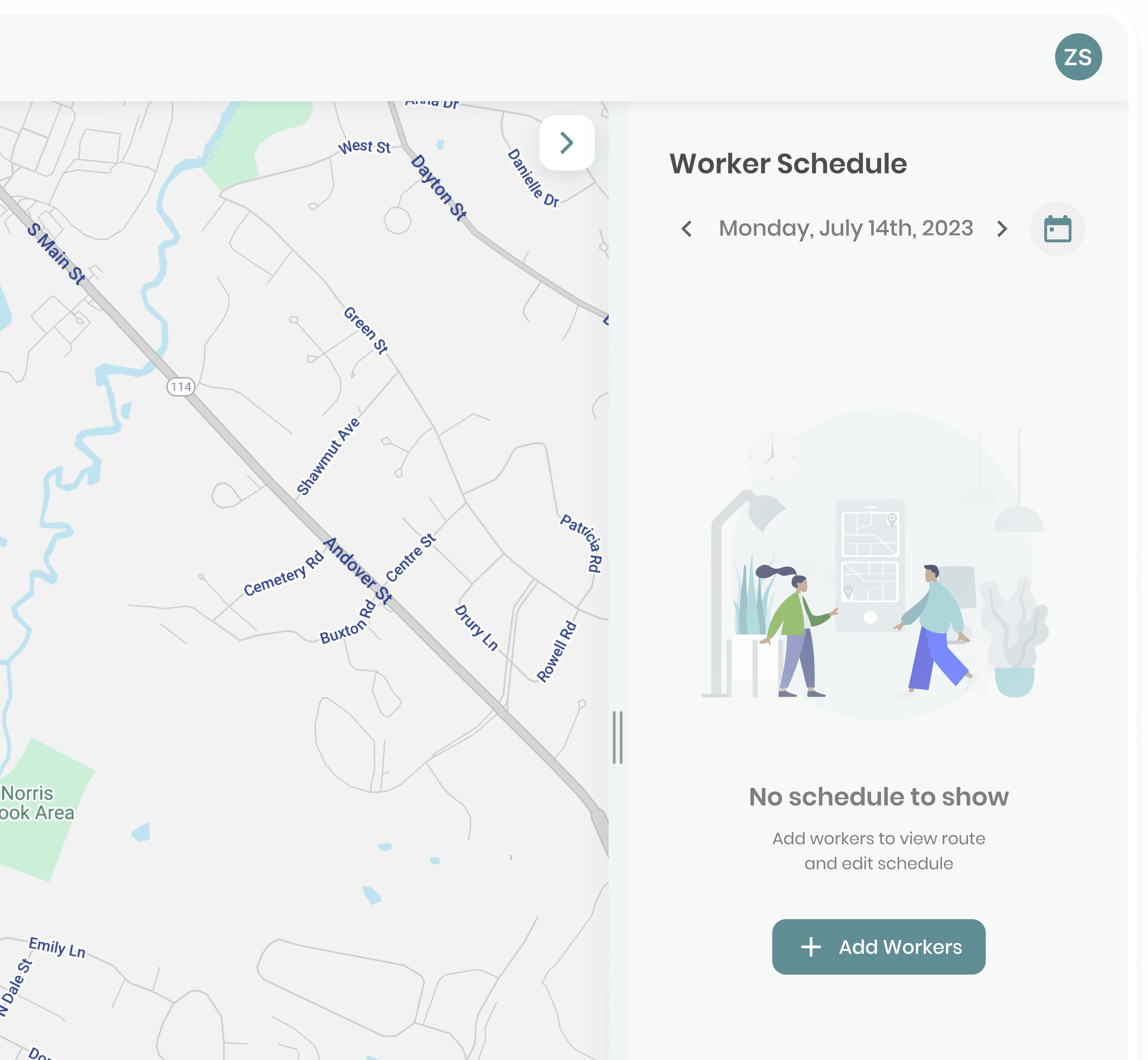 A functional empty state replaces the blank map, clearly explaining the current state and guiding users to add workers. This removes initial ambiguity and gives managers a clear, intentional starting point.