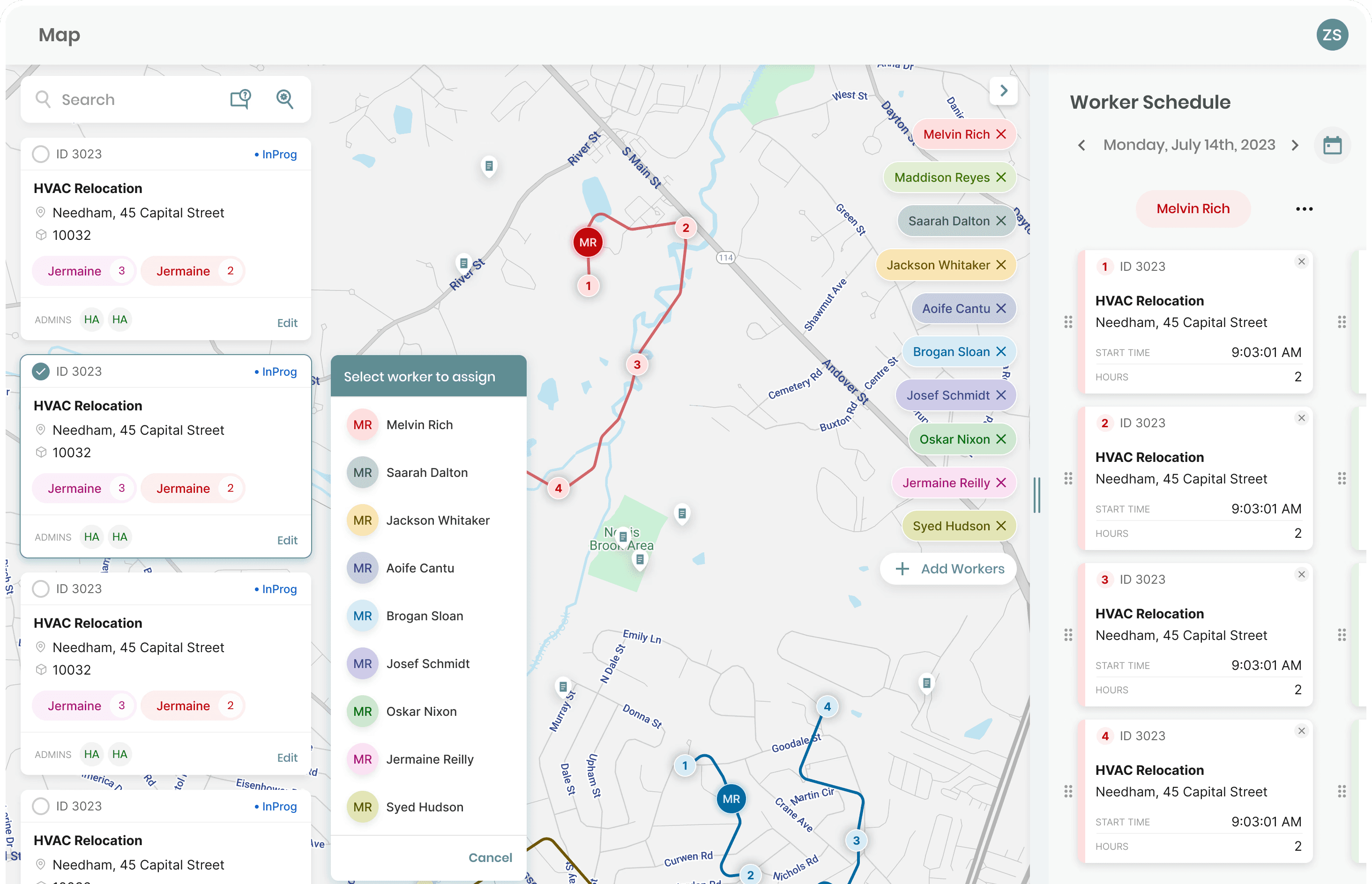 Trigger a dedicated “Assignment Mode” on work order selection, allowing the worker list to both surface availability and function as the primary assignment mechanism.
